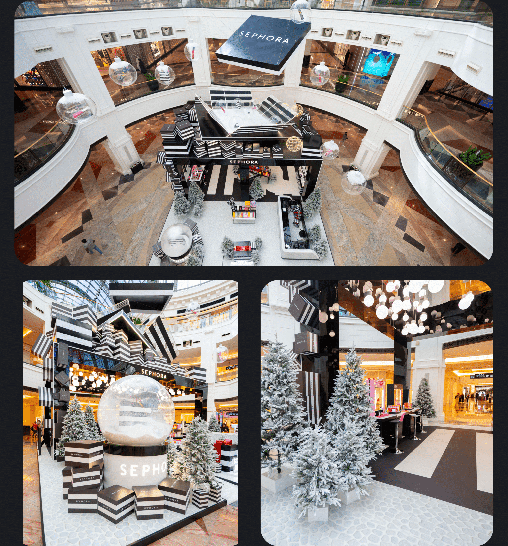 Pushing the holiday retail experience in Dubai.From concept to execution, Altavia ensured both a visually striking and operationally seamless activation.A towering “exploding” gift box installation, featuring suspended holiday ornaments filled with Sephora products, was at the center of the campaign, creating an immersive brand moment that drew shoppers in and created an emotional experience.Navigating height restrictions and installation complexities required extensive coordination with mall authorities. Altavia secured special approvals, allowing for structural elements that exceeded standard height limitations—going literally above and beyond to ensure maximum impact.Managing structures over 12 meters high, we coordinated structural testing, production, and an overnight installation across two malls in just two nights.Beyond design and execution, we created an interactive brand space where shoppers could actively engage with the event. A snow-blowing Christmas pendant set the festive mood, while a selfie booth encouraged social participation, further amplifying the campaign’s reach.
