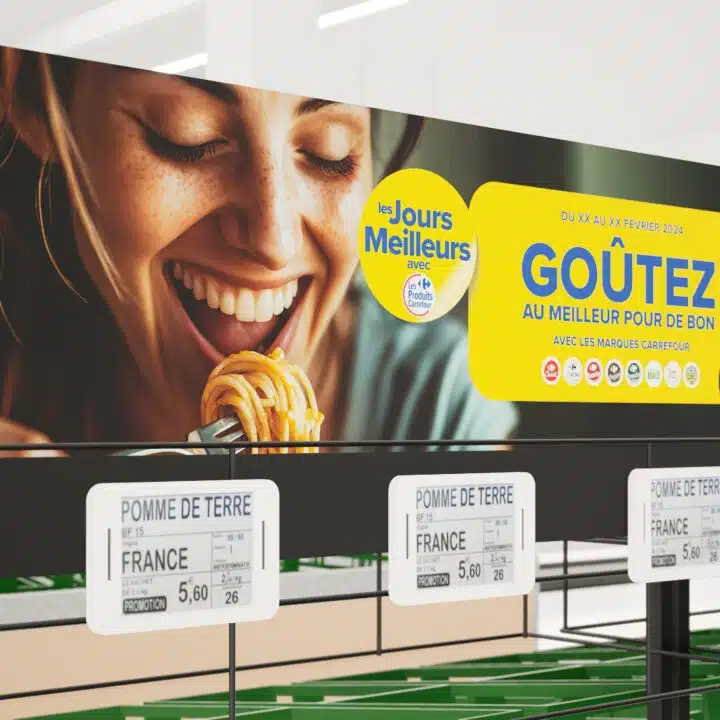 Briser les conventions visuelles La direction créative s’est éloignée de la palette habituelle de Carrefour, utilisant un jaune vif pour renforcer la visibilité et différencier la campagne au sein de l’écosystème Act for Food.