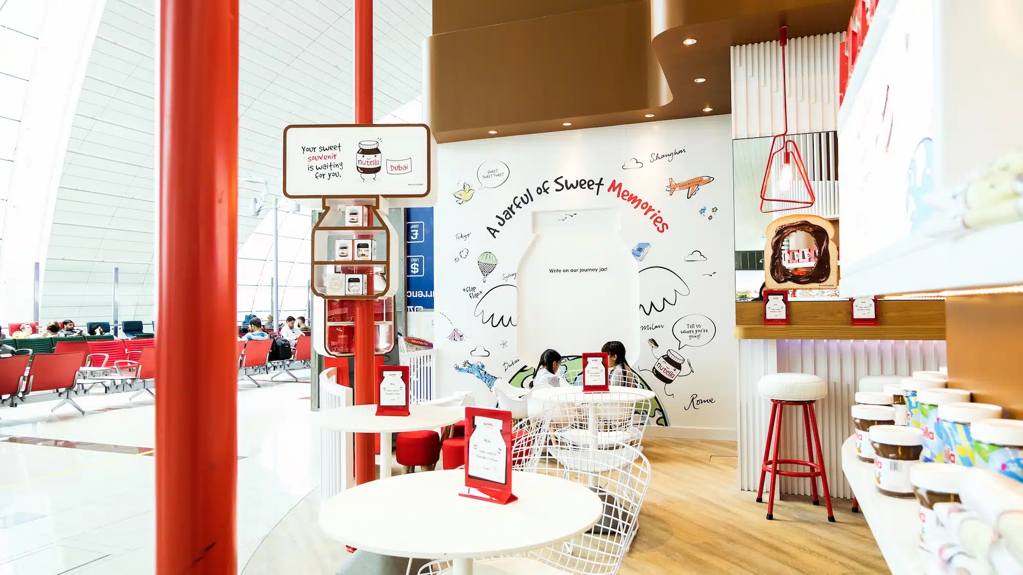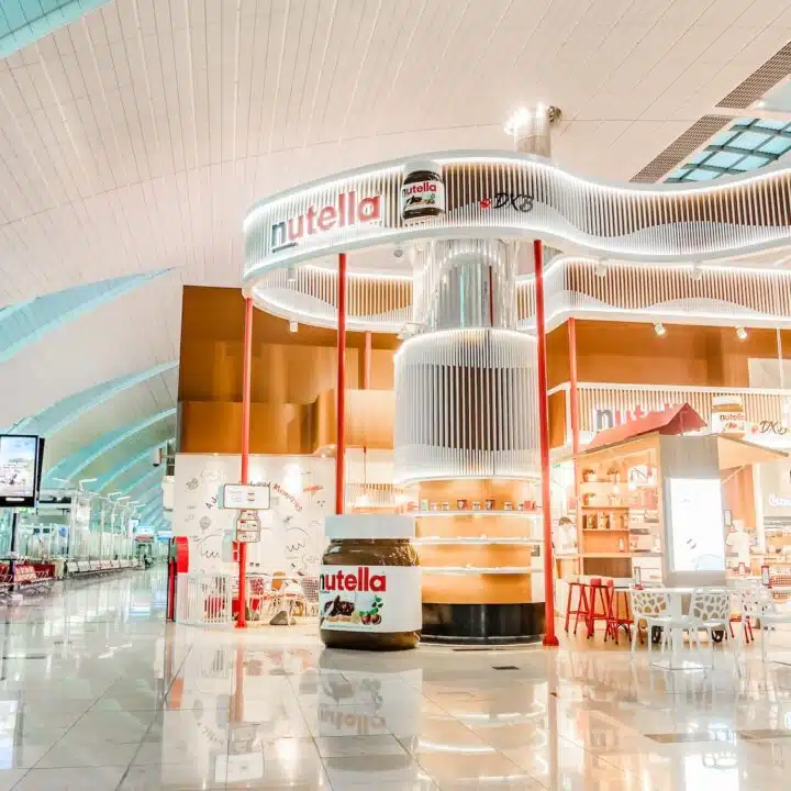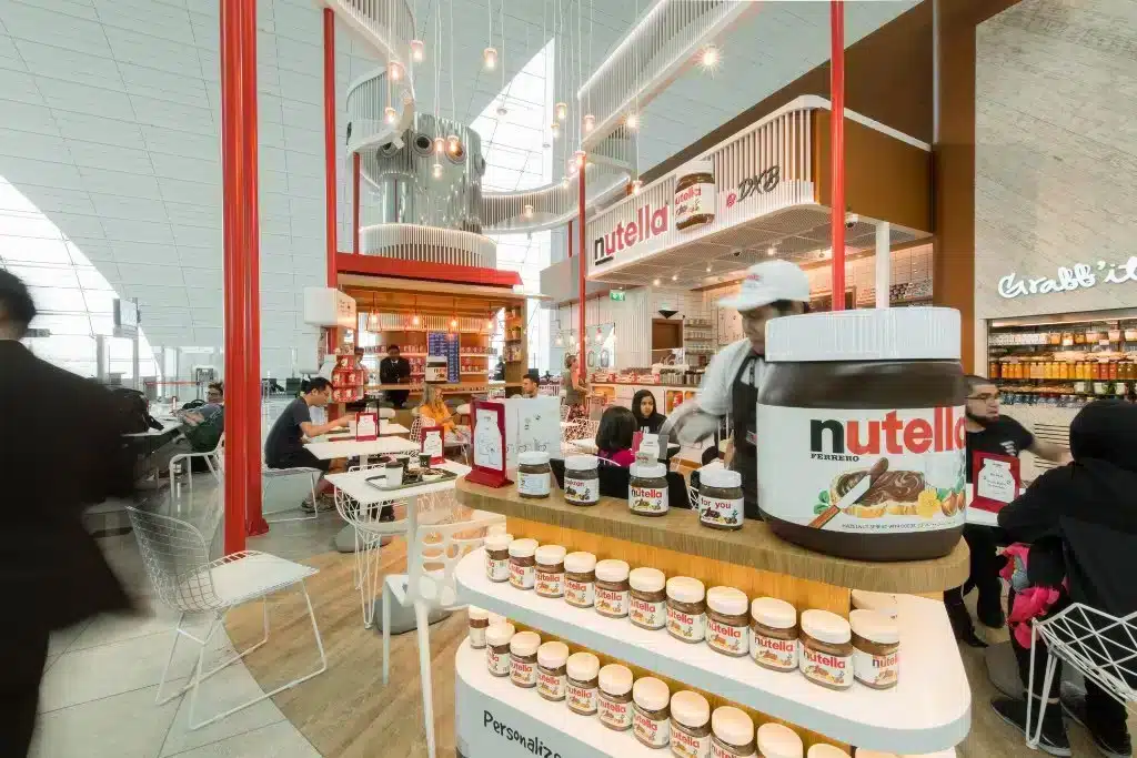 Nutella, produit phare de Ferrero, bénéficie d’un statut iconique à l’échelle mondiale mais restait peu présent sous forme d’espace retail dédié dans l’univers du travel retail. L’ambition était de créer un lieu à la fois destination culinaire et vitrine de marque, renforçant l’équité de Nutella par le design. L’aéroport international de Dubaï, l’un des plus fréquentés au monde, représentait un emplacement stratégique offrant une visibilité maximale et une audience internationale. Le partenaire local de Ferrero, HWH, avait besoin d’un concept capable de traduire la résonance émotionnelle du produit en un format physique et opérationnel adapté à l’environnement aéroportuaire.