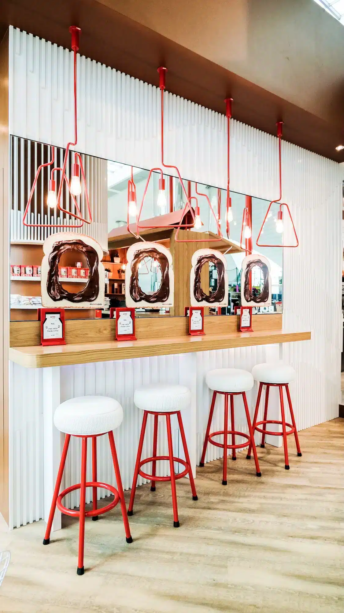 Le lieu a été conçu comme un hommage multisensoriel à Nutella, intégrant des codes esthétiques inspirés du célèbre pot et offrant des expériences personnalisées aux visiteurs.