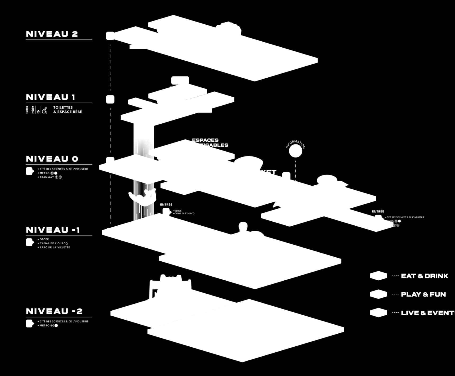 Boom Boom Villette se présente comme le premier lieu en France à réunir la food, une offre loisirs XXL, ainsi qu’une large programmation événementielle. Ces trois points d’appui ont été pensés pour répondre au mieux aux attentes des consommateurs. L’objectif du lieu étant de toucher toutes les cibles possibles, des jeunes actifs aux amateurs de musique, en passant par les familles à la recherche d’activités loisirs pour tous les âges. Boom Boom Villette invite ainsi tous les Parisiens, de passage ou permanents, à venir bruncher, trinquer, goûter, jouer, s’amuser, chanter, expérimenter et même s’envoler. Le lieu s’inscrit alors comme le plus grand espace de loisirs indoor et le plus vaste market food de Paris.